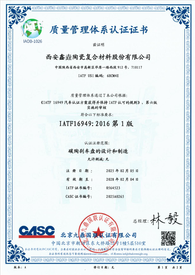 近日,西安鑫垚陶瓷復(fù)合材料股份有限公司收到了北京九鼎國(guó)聯(lián)認(rèn)證有限公司下發(fā)的IATF 16949汽車(chē)質(zhì)量管理體系認(rèn)證證書(shū),認(rèn)證注冊(cè)范圍為“碳陶...